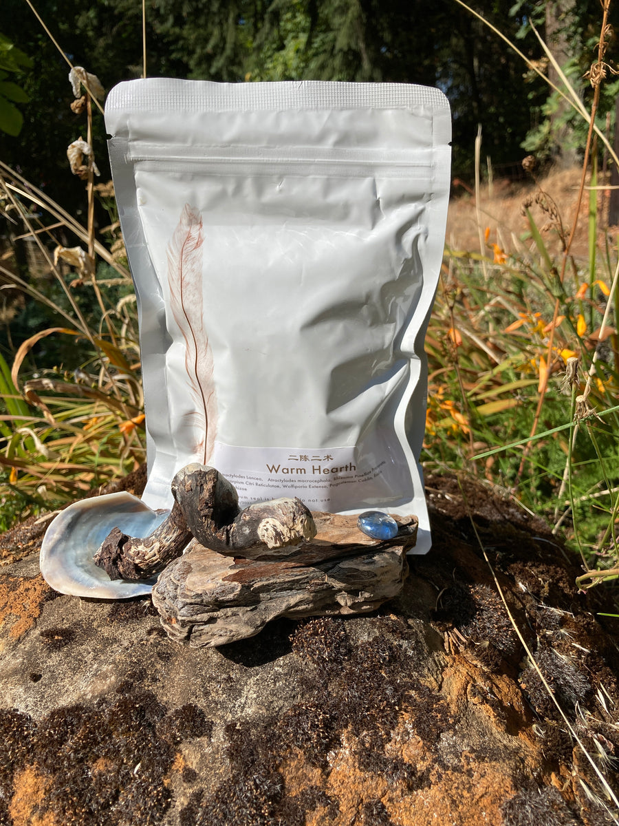 Warm Hearth Tea is the formula Er Chen Er Zhu tang, a classical modification of Er Chen tang with two kinds of atractylodes: Bai Zhu (white) and Cang Zhu (red).