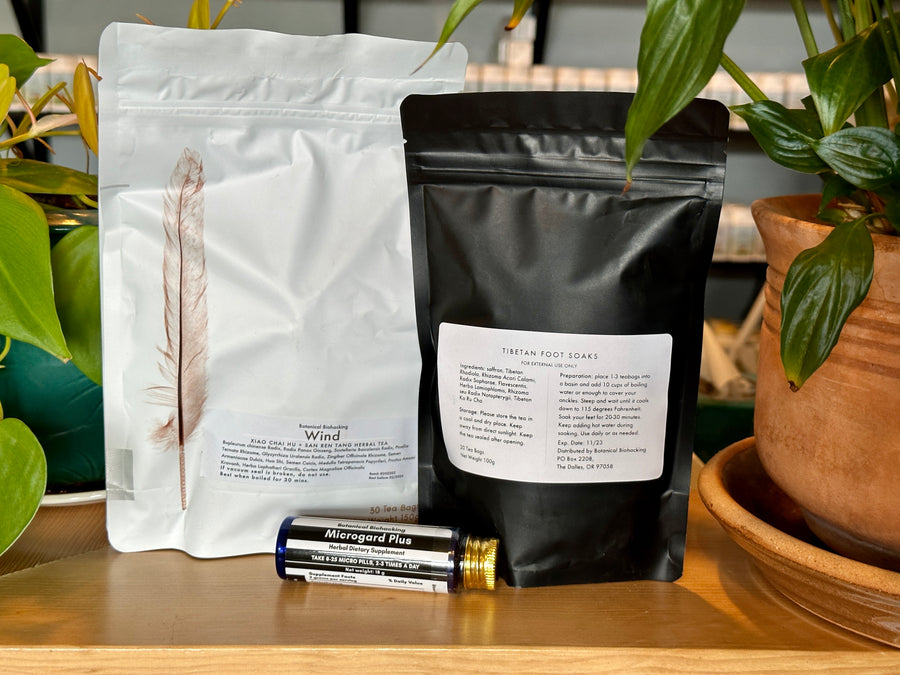The combination of three products: Wind Tea (Xiao Chaihu Jia Sanren Tang), Chorus Gut Harmony and Tibetan Foot Soaks work synergistically to inhibit viral replication, reduce post-viral inflammation and pain (especially Wandering pain), dissolve biofilm and promote a healthy microbiome to kick-start recovery. The foot soak additionally can also help to induce a therapeutic sweat -- a very important part of stage 1 treatment.
