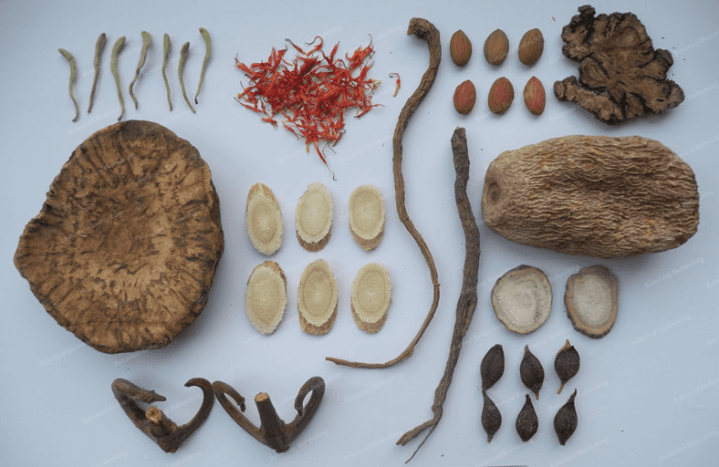 Huang Qi - Astragalus Root,Dang Gui - Chinese Angelica RootChuan Xiong - Ligusticum RootChi Shao - Red Peony RootTao Ren - Peach KernelHong Hua - SafflowerTian Ma - Gastrodia TuberGou Teng - Uncaria Rhynchophylla StemDa Huang - Rheum Tanguticum RootJin Yin Hua - Japanese honeysuckle FlowerLian Qiao (Qing) - Forsythia Fruit
